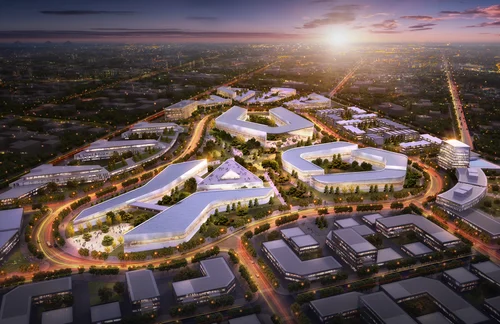 The project integrates sustainable design strategies including passive cooling, solar energy generation, water recycling systems, and adaptable building typologies that respond to climate and context. Transportation infrastructure includes internal transit systems, emergency access routes, and integration with broader city mobility plans.