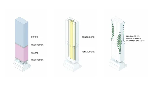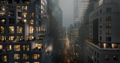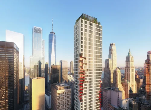 In an era of iconic skyscrapers, Nassau brings the qualities of residential living to a neighborhood populated by office towers. Along the tower's height, the volume edges are fragmented through an undulation of terraces. This identifies the building among the surrounding two-dimensional envelopes and provides exterior space unaccustomed to the Financial District's skyscrapers. A rooftop tree garden characterizes the building's pinnacle, capped like a natural version of the Woolworth peak.