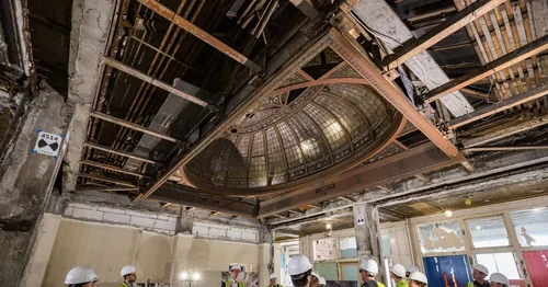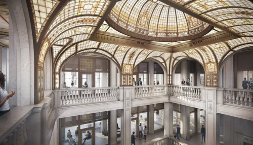 An extensive exterior restoration included the replacement of 2,483 historically-accurate windows and full restoration of the ornamental cornice complete with caryatid statues. A historic art glass skylight will be brought back to its original splendor as part of the restoration work.