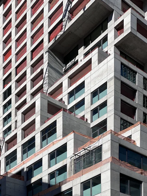 126 East 57th Street spans the width of a full city block, extending from 56th to 57th Street, and is envisioned as a 175,000-square-foot residential tower. Nearly every unit will include a private outdoor terrace, animating the cast-in-place concrete façade with a sculptural composition of projections and recesses. The primary entrance on 57th Street invites residents through a copper-mirrored gateway into a dramatic six-story atrium, offering views into a lushly landscaped courtyard. A gallery leads from the atrium to the main lobby, which provides access to the 28-story tower above. A secondary entrance, located along 56th Street, features a discreet porte-cochère for convenient vehicular drop-off.