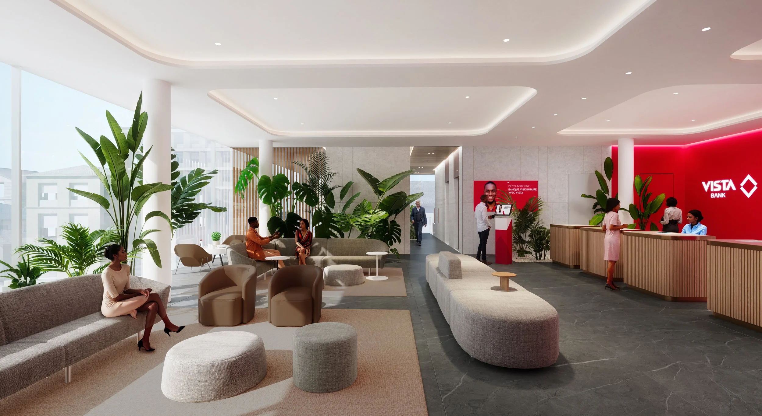 Breaking away from the dark and insular norms of traditional banking halls, the Vista Bank HQ reimagines what a banking space can be. Infused with natural light and sweeping views, the interior fosters a sense of openness and clarity. With curated greenery, panoramic rooftop gardens, and a refined material palette inspired by Sierra Leone’s landscapes and culture, the environment feels both sophisticated and grounded. It is a space designed to be not just seen, but experienced—blending modern elegance with regional authenticity.