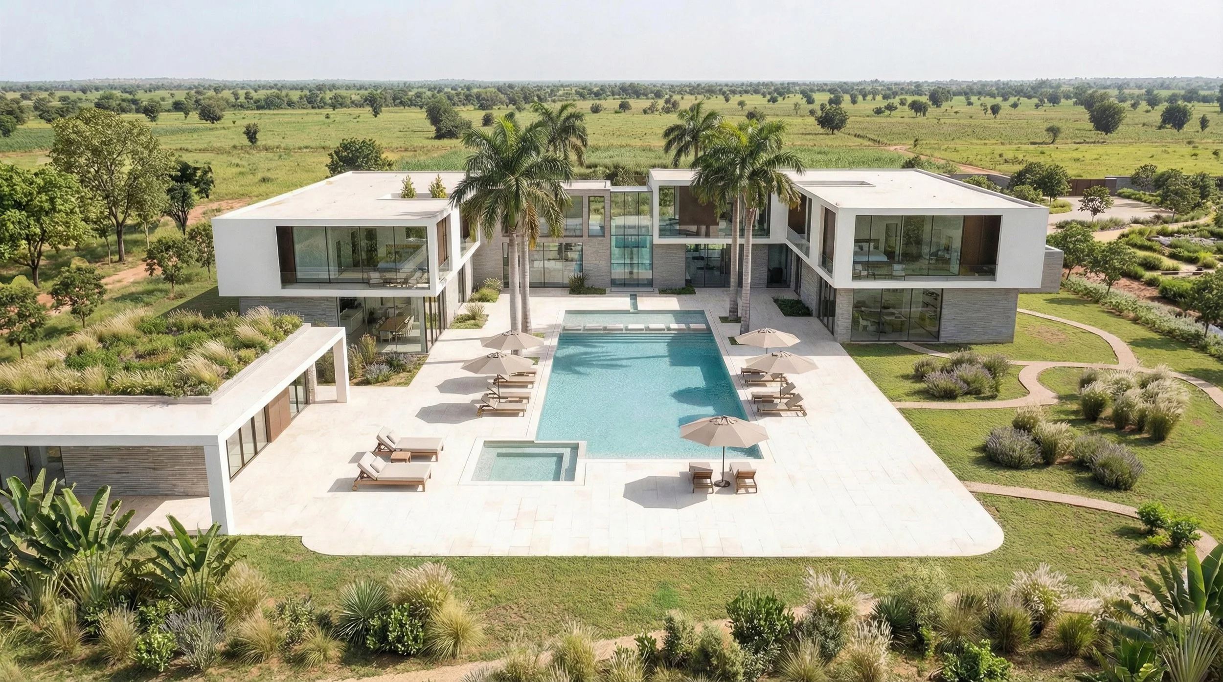 Set within a 6.62-hectare agricultural landscape in Zorgho, this luxury private villa is conceived as a contemporary estate deeply rooted in its natural and cultivated surroundings. The approximately 25,000-square-foot main residence is positioned as the focal point of the site, with its layout shaped by a clear emphasis on human experience, movement, and visual connection to the landscape. Productive farmland surrounds the house, reinforcing privacy while forming an integral part of the daily lived environment.