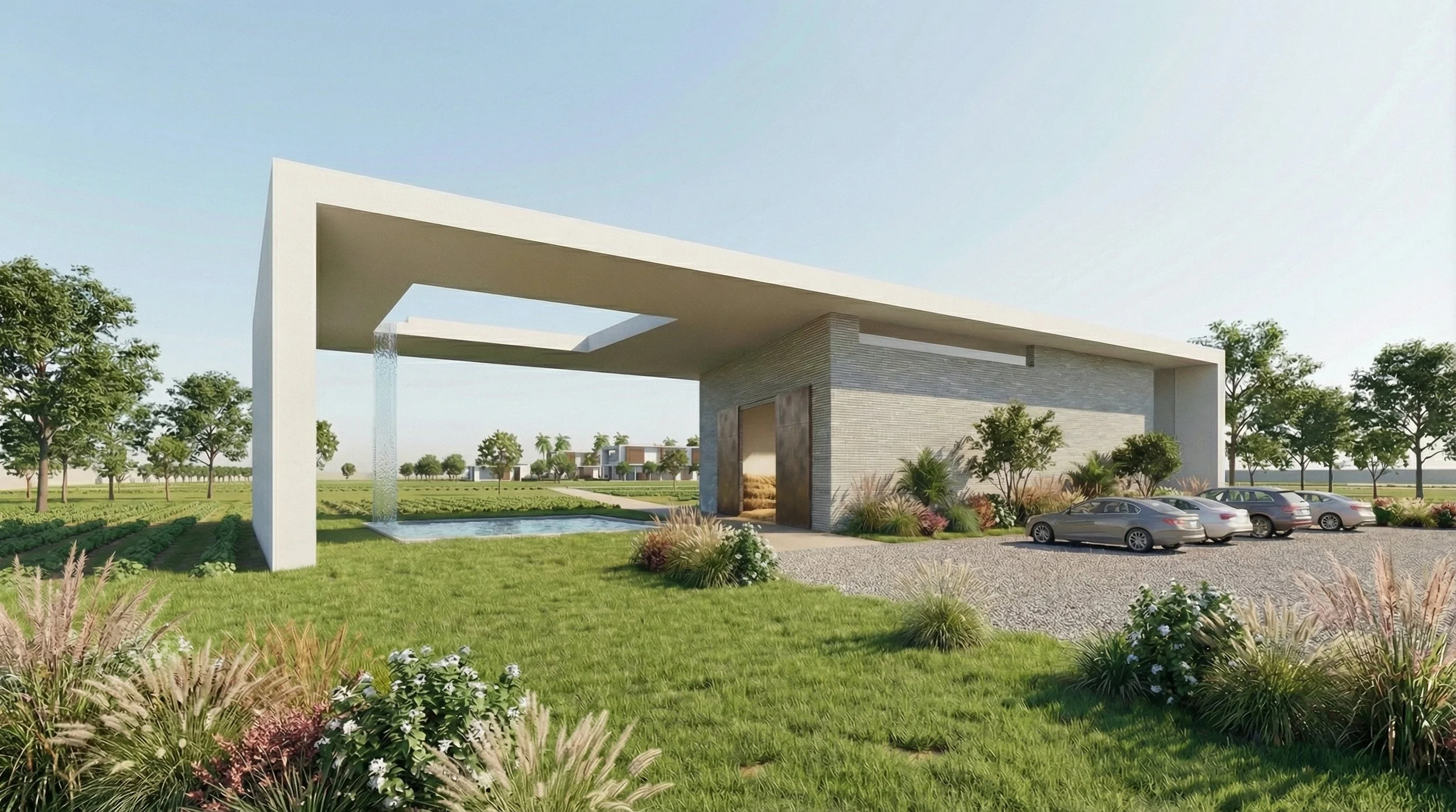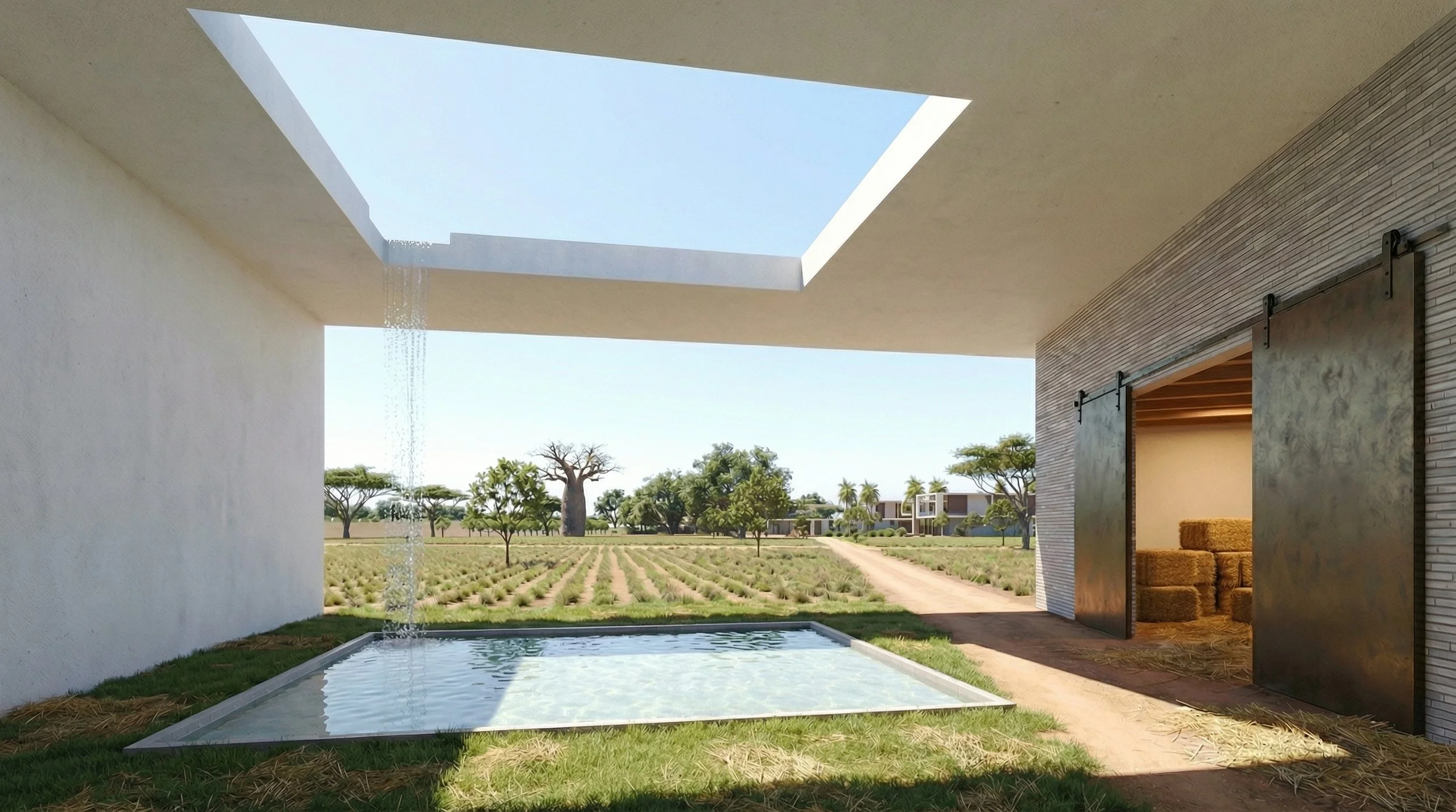 On the upper level, private pocket gardens and outdoor decks are embedded within the building mass, offering intimate retreats and moments of pause. A green roof further enhances views from above while contributing to thermal comfort and reduced heat gain. Together with the surrounding cultivated fields, the landscape functions as an active system—shaping microclimate, enhancing comfort, and strengthening the relationship between architecture, agriculture, and daily life.