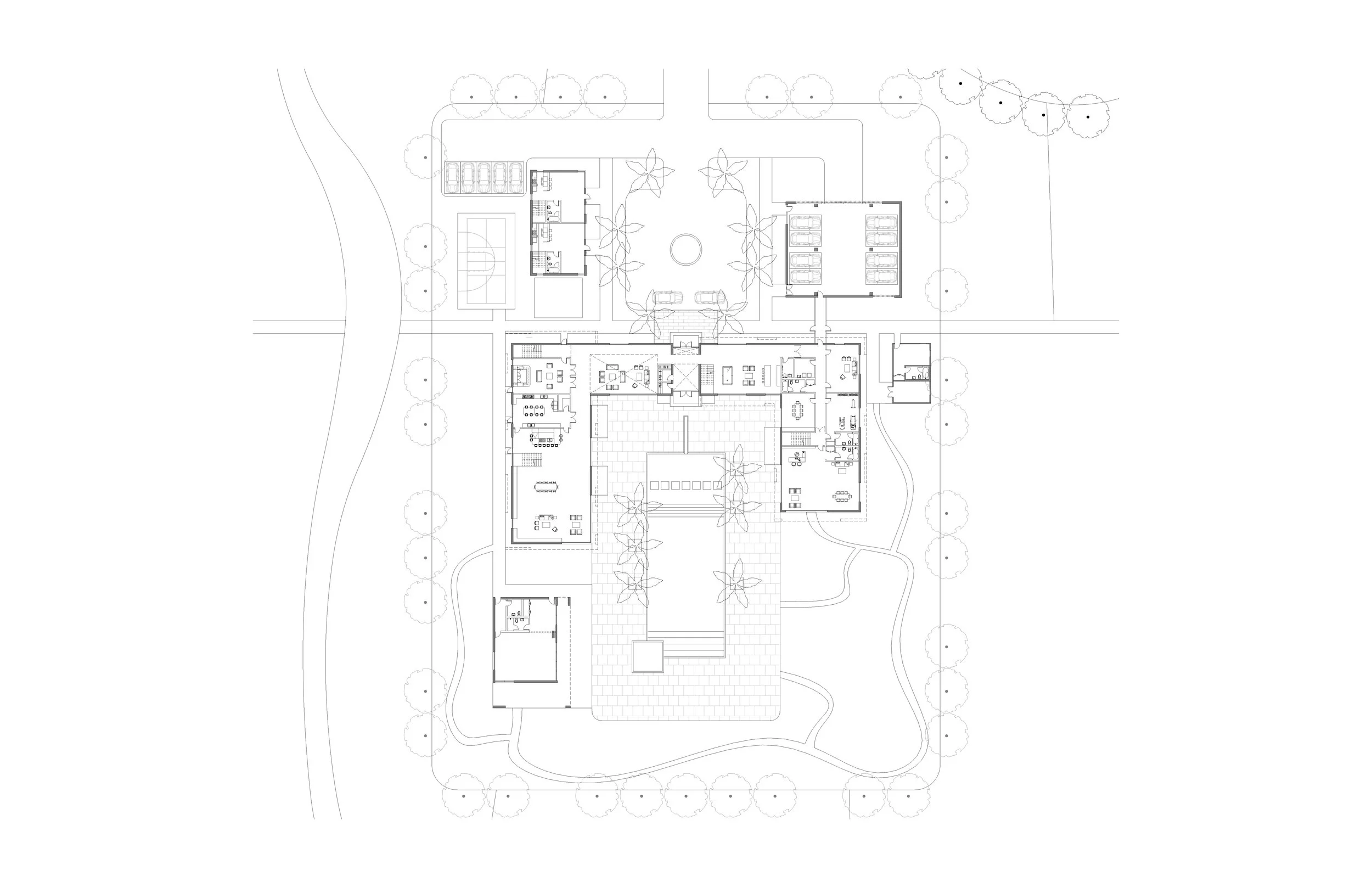 Arrival is carefully choreographed through a long, winding driveway, establishing a gradual and picturesque sequence that heightens awareness of scale, distance, and setting. This procession allows the landscape to unfold slowly, reinforcing a sense of transition and anticipation before reaching the main residence.