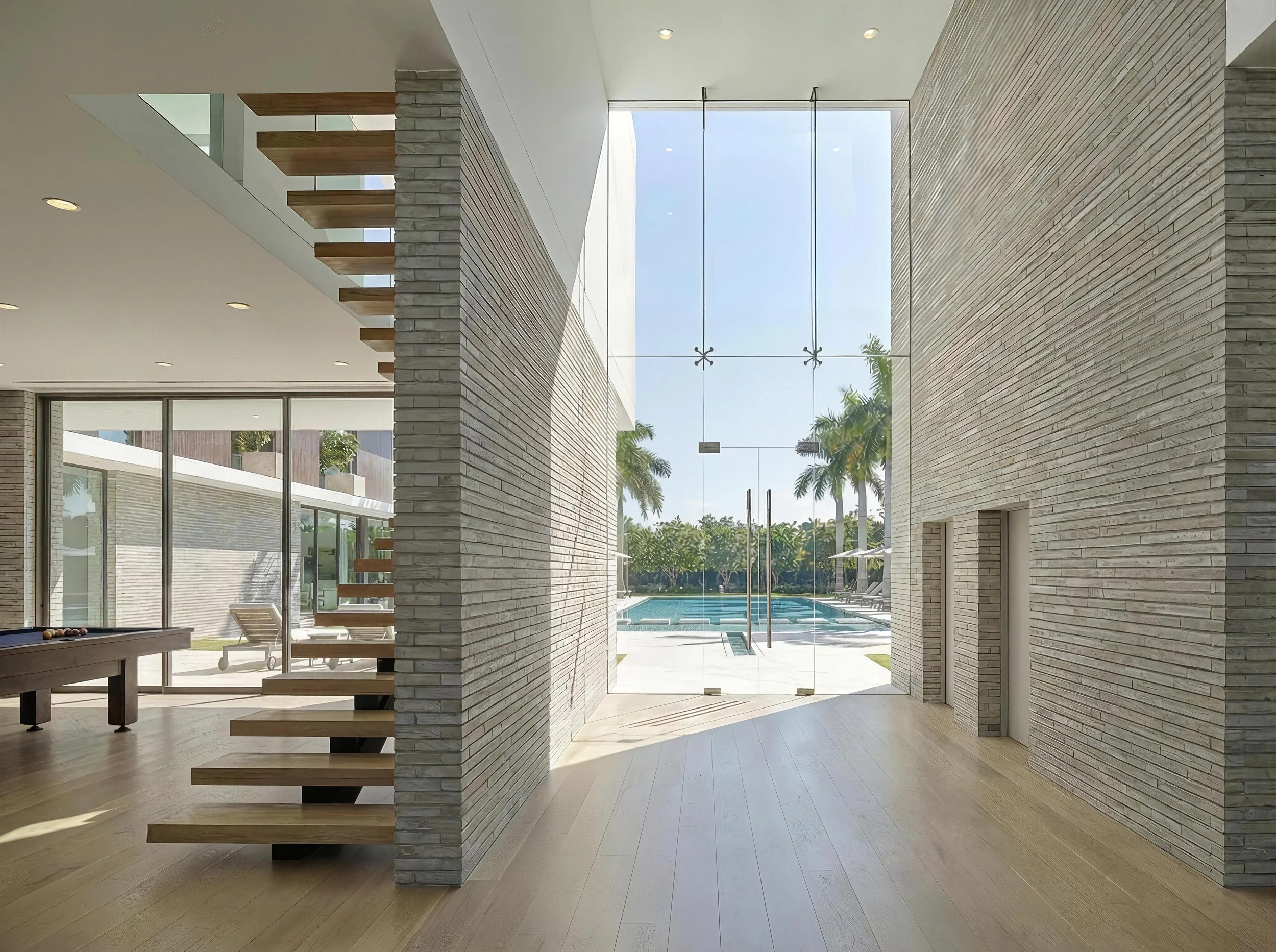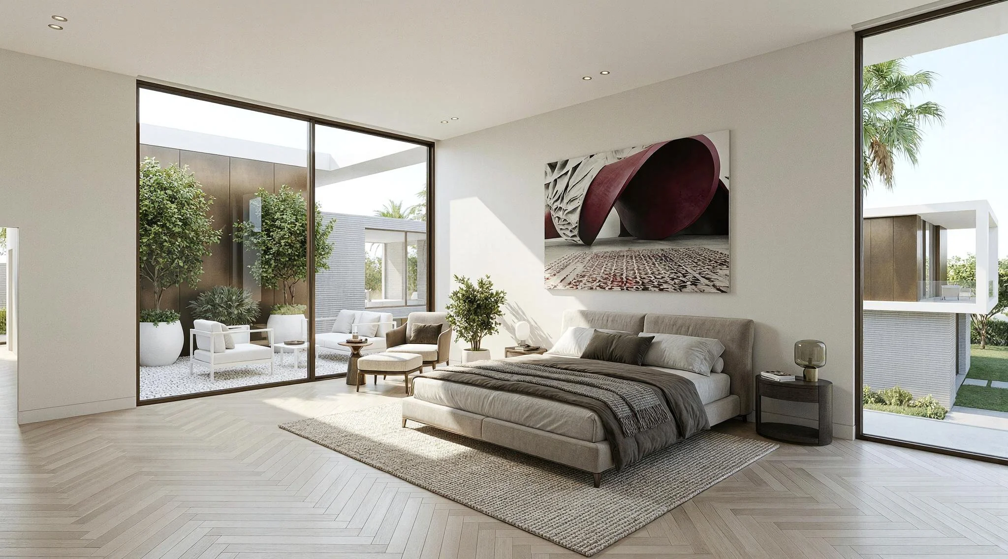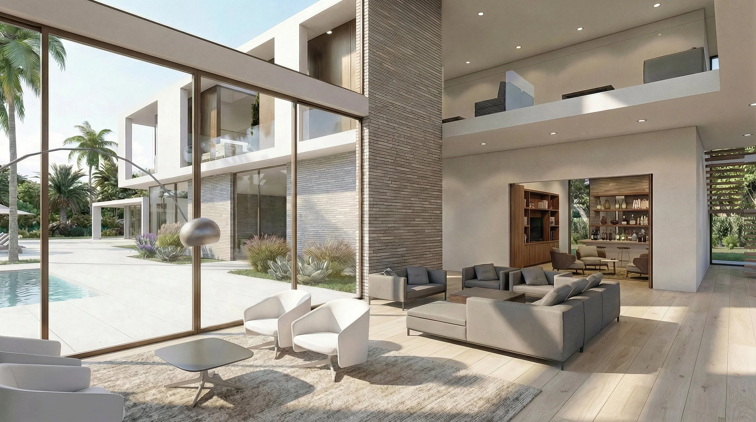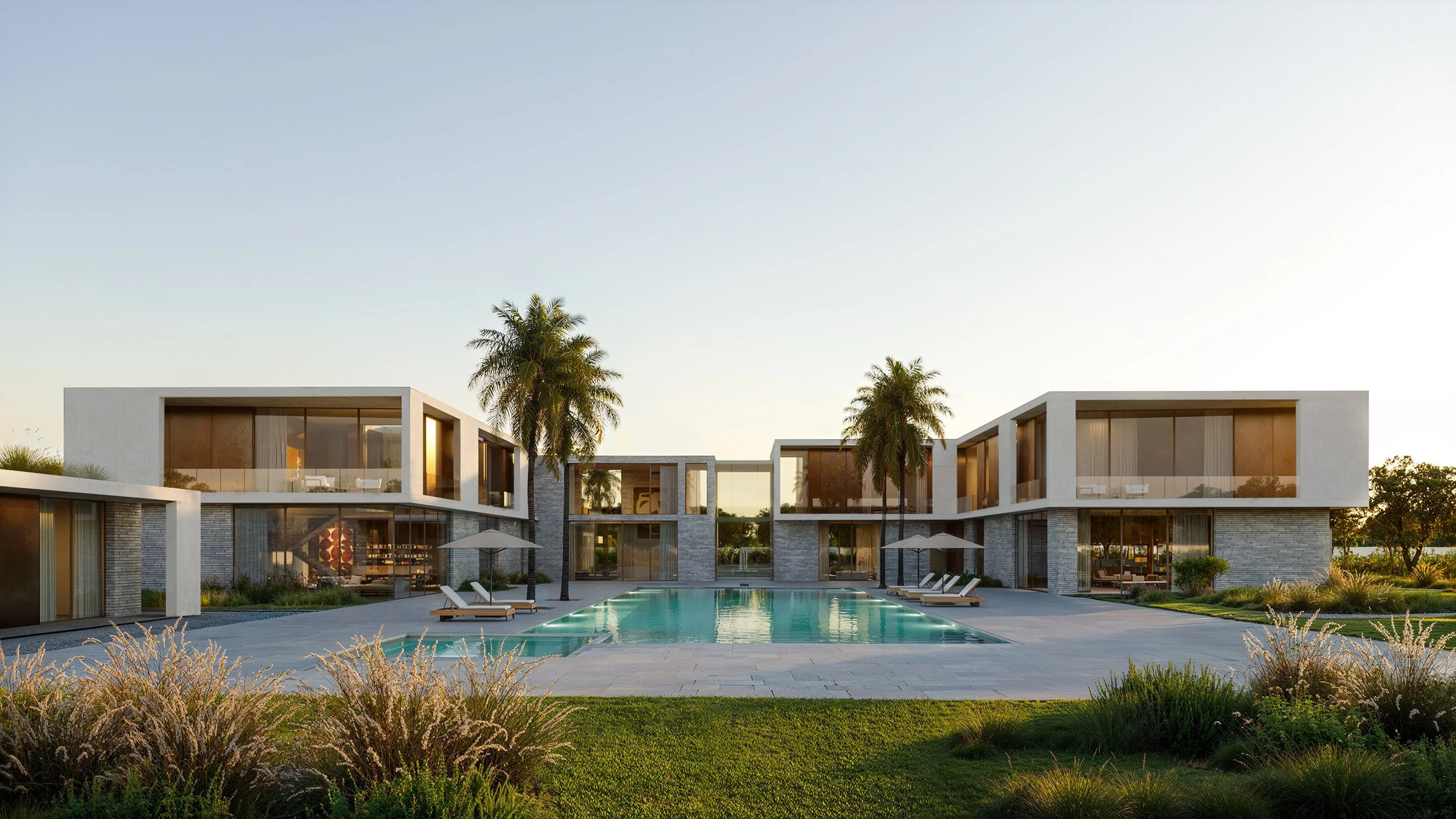 Architecturally, the villa is defined by a restrained and climate-responsive material palette. White architectural concrete frames establish structure and rhythm, while light gray horizontal brick introduces texture and scale. Antique bronze panels and dark bronze window frames provide warmth and contrast, enriching the tactile and visual experience at close range.